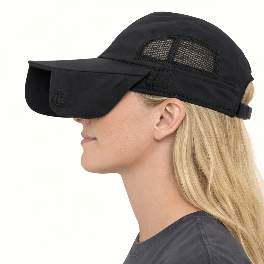 Den hevede skjermen er konstruert for å unngå sammenstøt med sikte, samtidig som den slipper mer lys til øyet for bedre fokus og presisjon. Toppen gir ekstra skjerming mot sol, regn og ytre påvirkning, noe som gjør luen velegnet for utendørs bruk og varierende forhold.